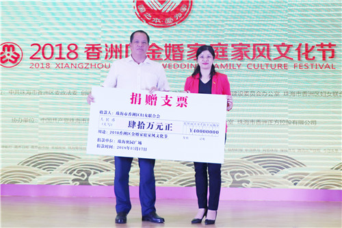 (2018年10月17日——珠海)10月17日,“國(guó)之本 愛為家”2018珠海香洲區(qū)首屆家庭家風(fēng)文化節(jié)在珠海奧園廣場(chǎng)啟動(dòng)。珠海市委政法委專委姜鐵鈞,香洲區(qū)委副書記、政法委書記劉繼漢,區(qū)委常委、組織部長(zhǎng)陳靜,副區(qū)長(zhǎng)、公安分局局長(zhǎng)、區(qū)平安辦主任鄭木舜,區(qū)婦聯(lián)主席黃芳,奧園集團(tuán)黨委副書記、紀(jì)委書記林莉等領(lǐng)導(dǎo)及來自拱北、前山等各鎮(zhèn)街道8對(duì)金婚伉儷代表,社會(huì)各界人士及媒體記者共計(jì)100余人出席。儀式上,奧園向區(qū)婦聯(lián)捐贈(zèng)40萬(wàn)元,以弘揚(yáng)家庭美德,傳播正能量。
