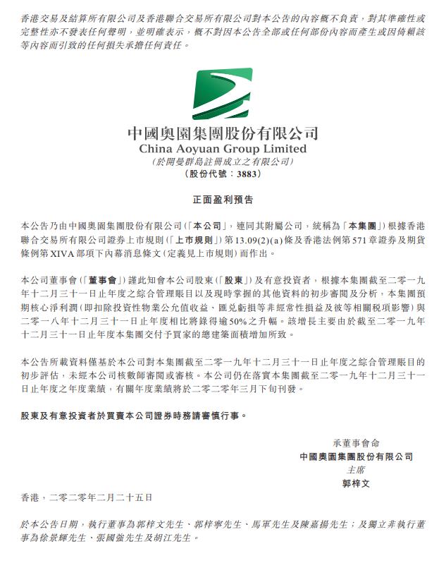 中國奧園:預(yù)計2019年核心凈利潤同比增幅逾50%