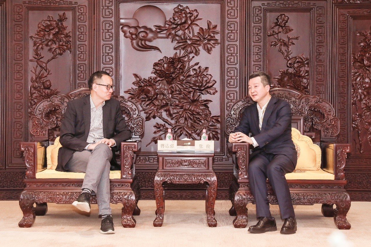 中國(guó)奧園集團(tuán)執(zhí)行董事、高級(jí)副總裁張俊(右)與弘陽(yáng)集團(tuán)總裁蔣達(dá)強(qiáng)(左)座談交流