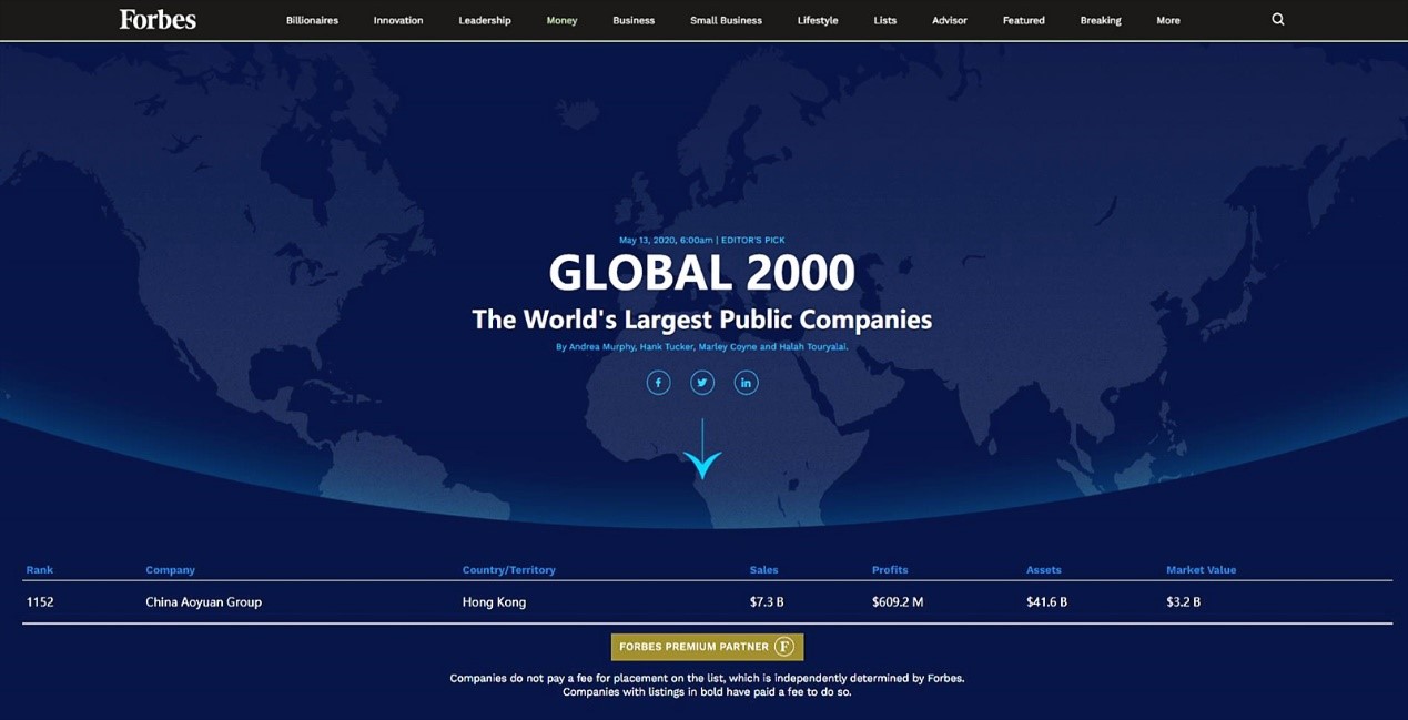5月13日,全球最具影響力的權(quán)威商業(yè)雜志之一——《福布斯》發(fā)布2020年上市公司2000強(qiáng)榜單。其中,中國奧園(3883.HK)以73億美元銷售額、6.092億美元利潤、416億美元總資產(chǎn)和32億美元市值首次躋身榜單,位列1152名。