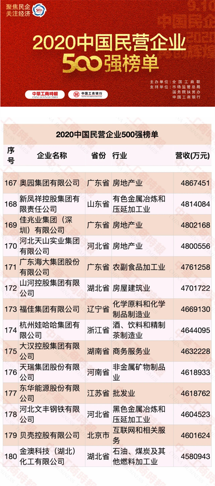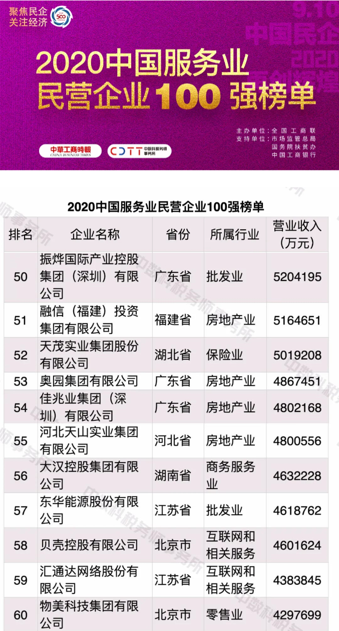 9月10日,由全國工商聯(lián)主辦的“2020中國民營企業(yè)500強峰會”在北京召開,同日2020年“中國民營企業(yè)500強”“中國民營企業(yè)服務業(yè)100強”榜單正式發(fā)布。