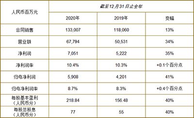 2020年,奧園錄得物業(yè)合同銷售人民幣1,330億元,圓滿完成全年目標(biāo),同比增長(zhǎng)13%,穩(wěn)居全國(guó)三十強(qiáng)。于2020年12月31日,已簽約未確認(rèn)的合同銷售約人民幣1,960億元,盈利持續(xù)性強(qiáng)。