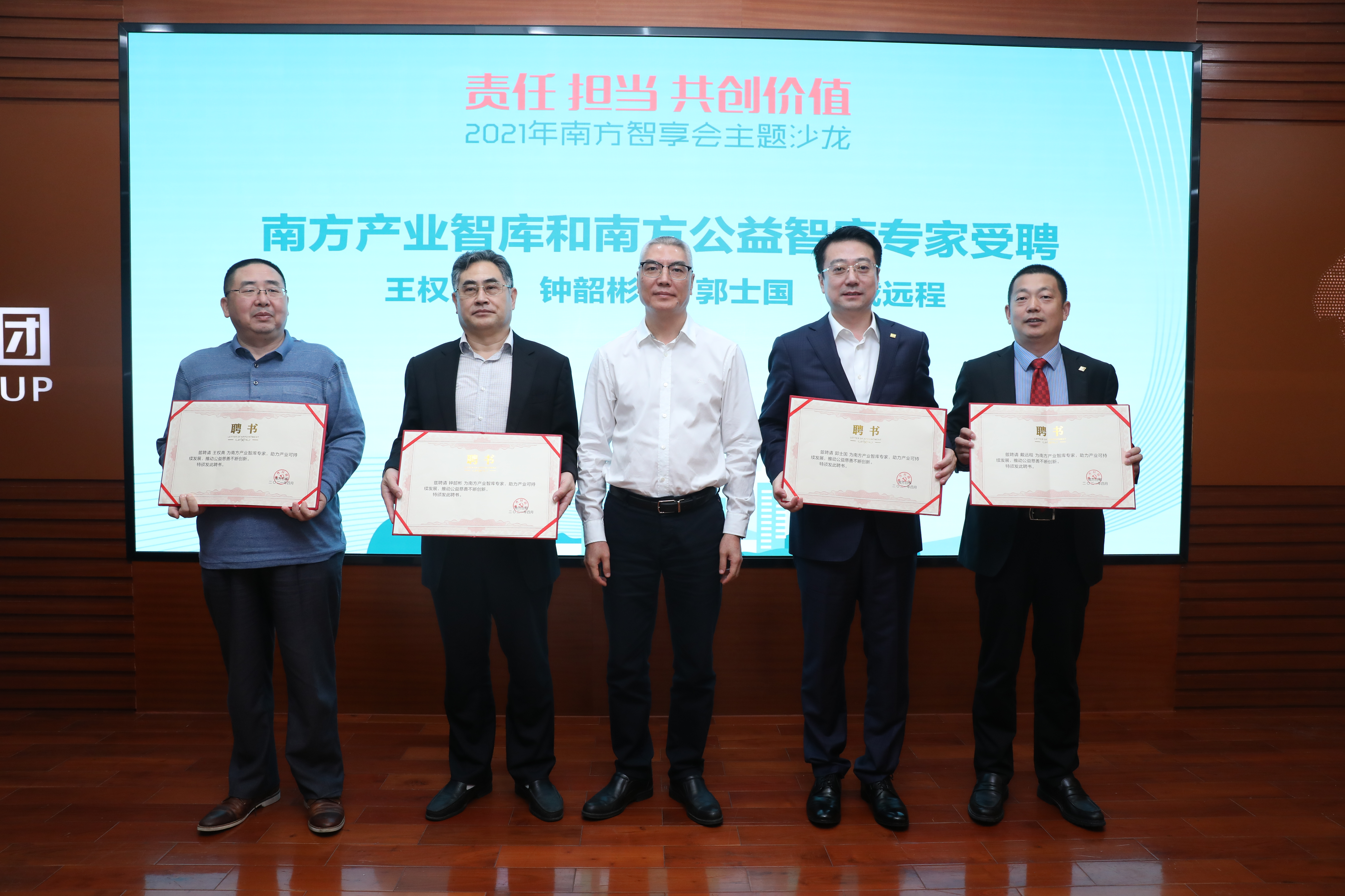 活動現(xiàn)場,南方報業(yè)傳媒集團副書記、副社長王更輝為郭士國、戴遠程、王權(quán)典和鐘韶彬等四位嘉賓頒發(fā)南方產(chǎn)業(yè)智庫和南方公益智庫專家聘書。