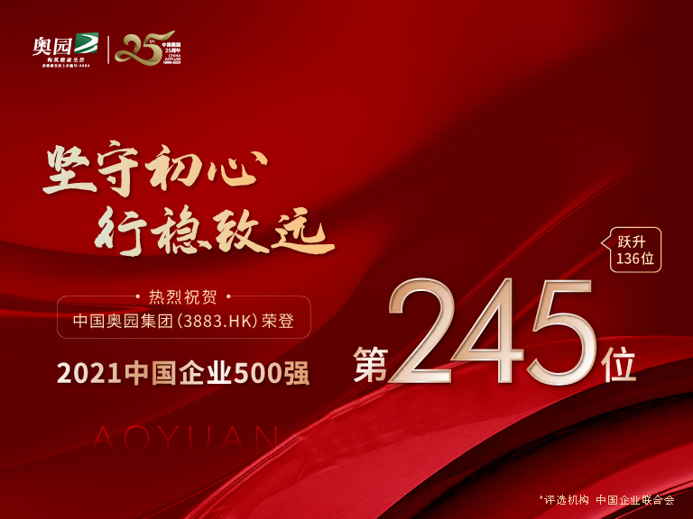 9月25日,中國(guó)企業(yè)聯(lián)合會(huì)主辦的“2021中國(guó)500強(qiáng)企業(yè)高峰論壇”正式發(fā)布了“2021中國(guó)企業(yè)500強(qiáng)榜單”,憑借穩(wěn)健的企業(yè)經(jīng)營(yíng)能力,中國(guó)奧園(3883.HK)榮登第245名,較去年勁升136位。