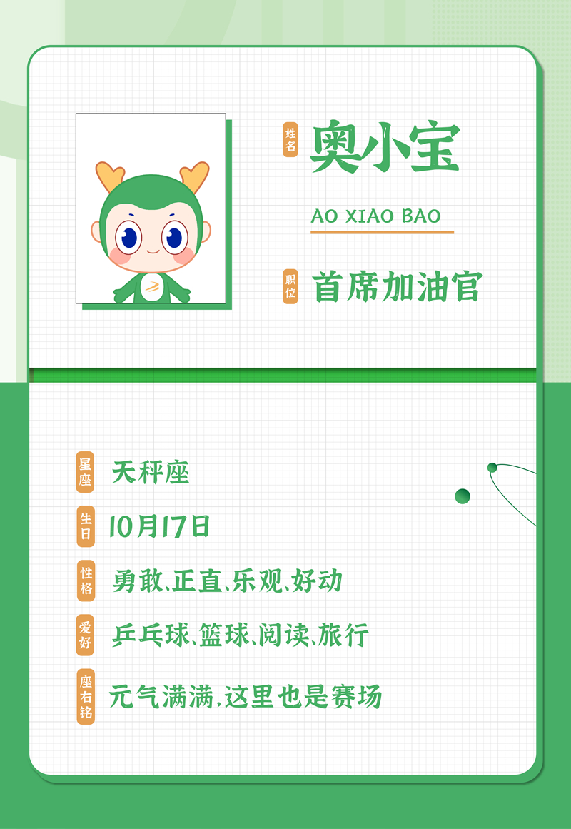 作為中國奧園集團首席加油官,奧小寶擁有多重身份和極具個性的生命特征。在賽場上,奧小寶是一位健康運動小達人,他以身體力行響應(yīng)全民健身、運動向上的健康熱潮,鼓勵業(yè)主、客戶、員工、合作伙伴、社會公眾一起加入構(gòu)建健康、時尚、運動生活方式的隊伍中。時刻對新鮮事物好奇心爆棚,登上賽場就有天秀的拿手好“戲”,生活中興趣愛好滿滿,十足的有趣、有料、有愛、有執(zhí)行力!