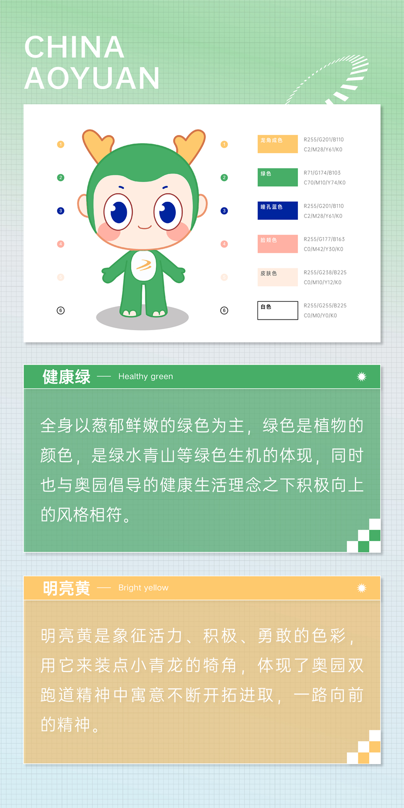作為健康生活倡導者,奧小寶綠色的外表,象征著健康、環(huán)保、生態(tài)、自然,犄角點綴明亮黃色,圓溜溜的大眼睛,清澈中透露一點嬌憨頑皮,其外形酷似東方青龍,身姿矯健,寓意傳遞運動健康的理念,和穩(wěn)健發(fā)展、基業(yè)長青的祝福,致力發(fā)揚“更快、更高、更強、更團結(jié)”奧林匹克精神,深度詮釋“構(gòu)筑健康生活”品牌理念,傳承奧園企業(yè)文化。
