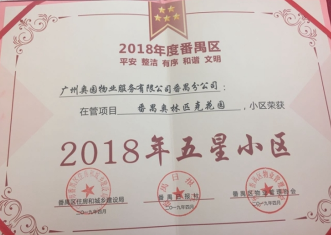 番禺奧林匹克花園獲評“番禺區(qū)2018年度五星小區(qū)”