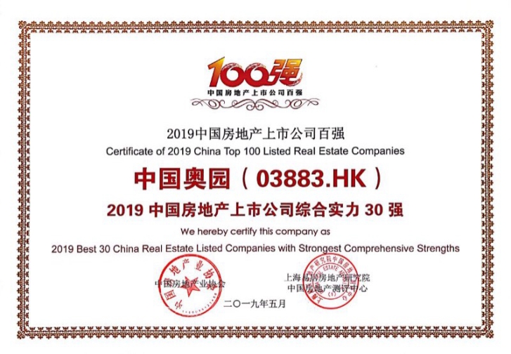 中國奧園榮獲“2019中國房地產(chǎn)上市公司綜合實力30強”