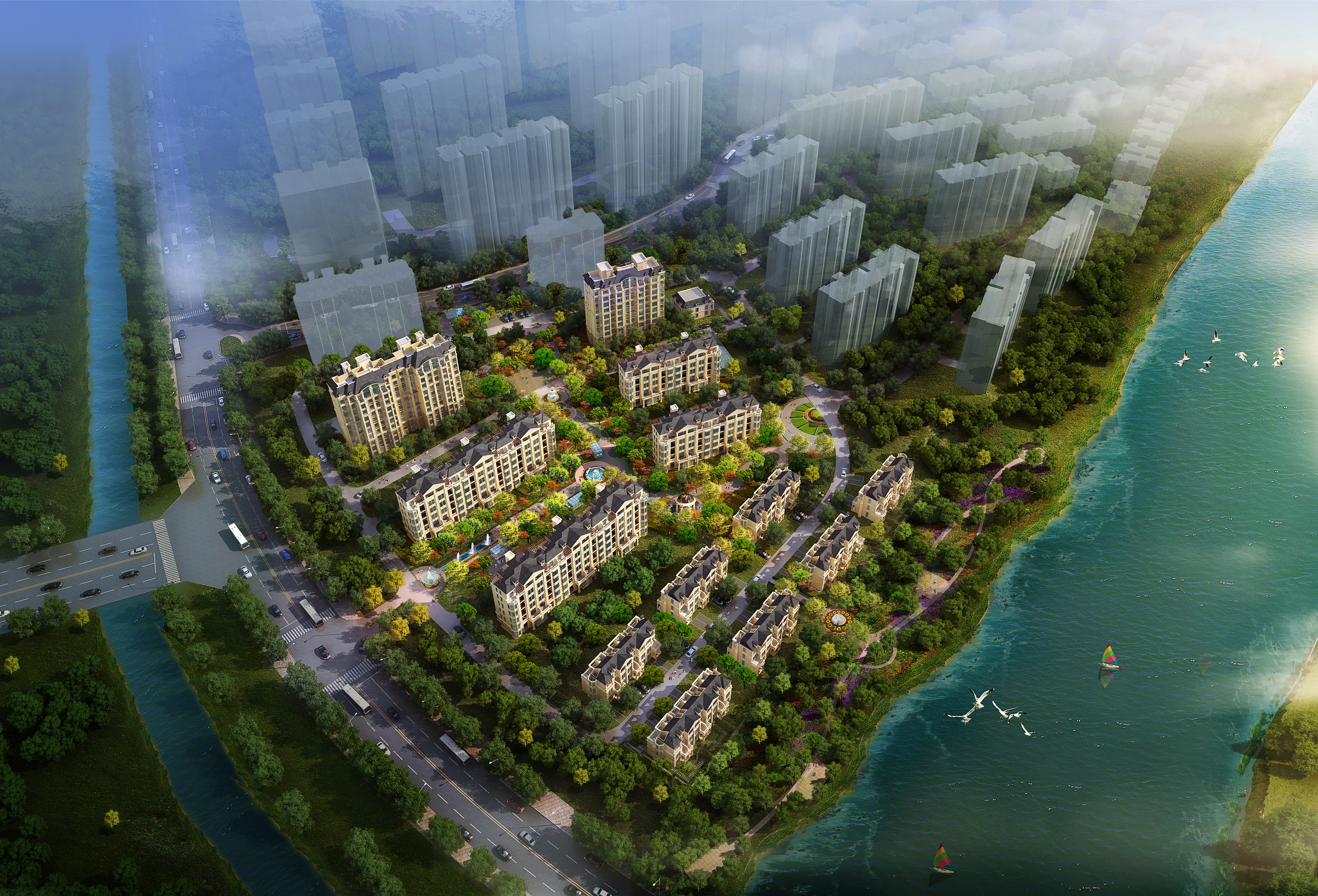 整個(gè)社區(qū)采用法式古典主義的建筑風(fēng)格,并通過(guò)建筑色彩及空間關(guān)系與周圍環(huán)境的協(xié)調(diào),充分結(jié)合原有地形、地貌等自然景觀資源,打造出一個(gè)自然景觀資源豐富的園林居住環(huán)境,從而實(shí)現(xiàn)業(yè)主的認(rèn)同感。
